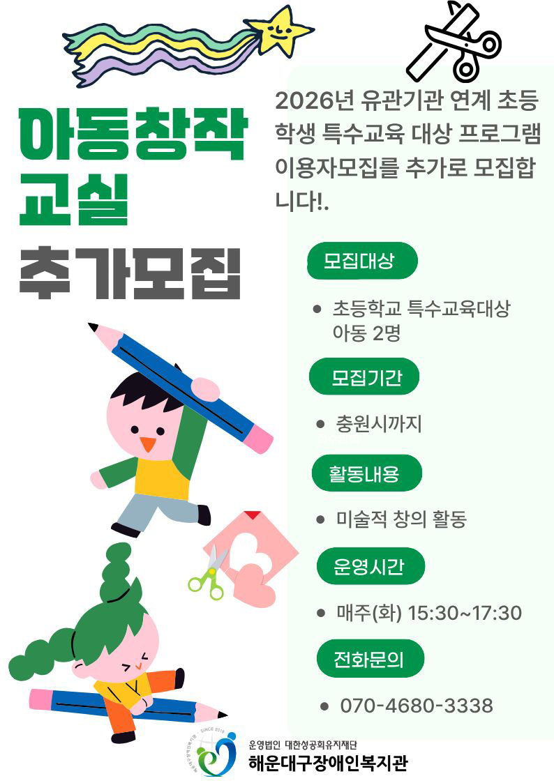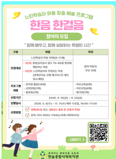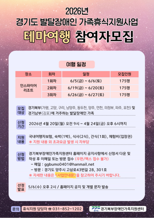 더보기 ›화성시 공지[카드뉴스] 경기도 인권센터 ‘오래된 장애, 만들어진 차별’화성시 공지4월 20일 장애인의 날…“경기도 장애인의 자립까지 도움 드려요!”서대문구[해담는도서관] 나도 부모는 처음이야 양경아 작가와의 만남(1개월~36개월 양육자 대상)성남시 공지[장애인 특별공급] 부천 「중앙하이츠 원종역」강화군2026 팀 창업패키지 지원사업 모집 재공고서대문구서대문구 청소년상담복지센터 우리아이를 위한 부모 성교육 안내성남시성남시, 세계 최대 의료기기 전시회 ‘메디카 2026’ 참가기업 모집수원시2026 수원시립미술관 신진작가 동행 얍-프로젝트(YAB-Project) 참여작가 공모