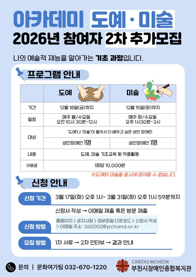 2026년 장애예술인 성장 "클래스" 프로그램 참여자 추가 모집(도예·미술)
