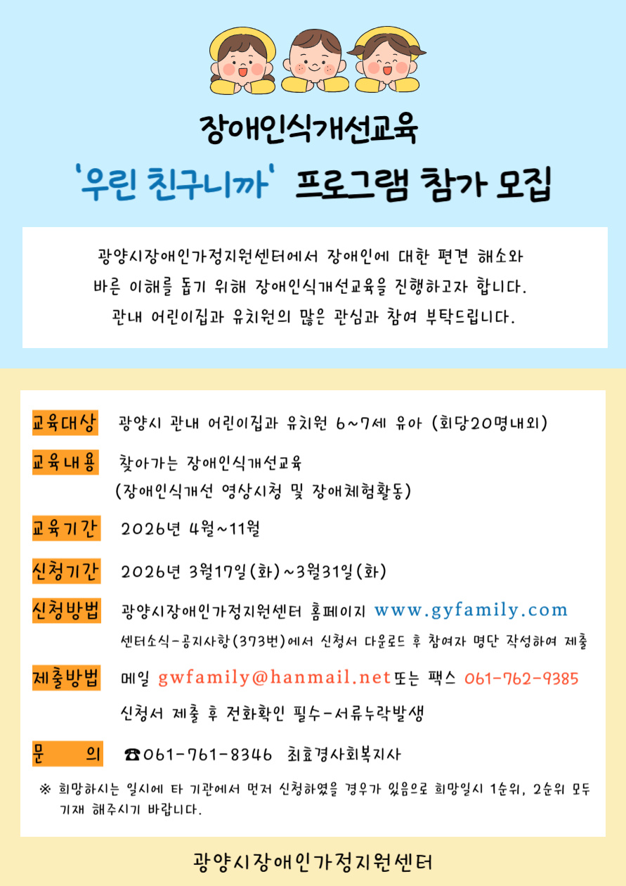장애인에 대한 편견 해소와 바른 이해를 돕기 위해 장애인식개선교육을 진행하니 많은 참여 부탁드립니다.