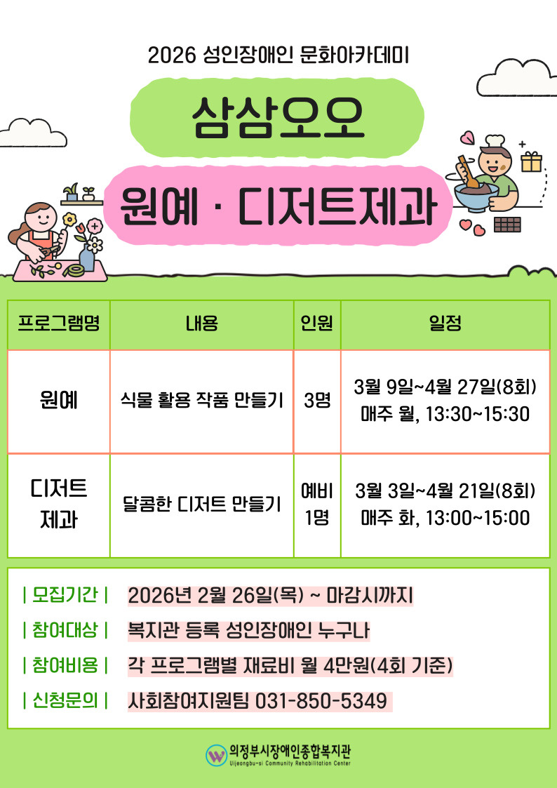 원예 : 매주 월 13:30~15:30 / 디저트 제과 : 매주 화 13:00~15:00