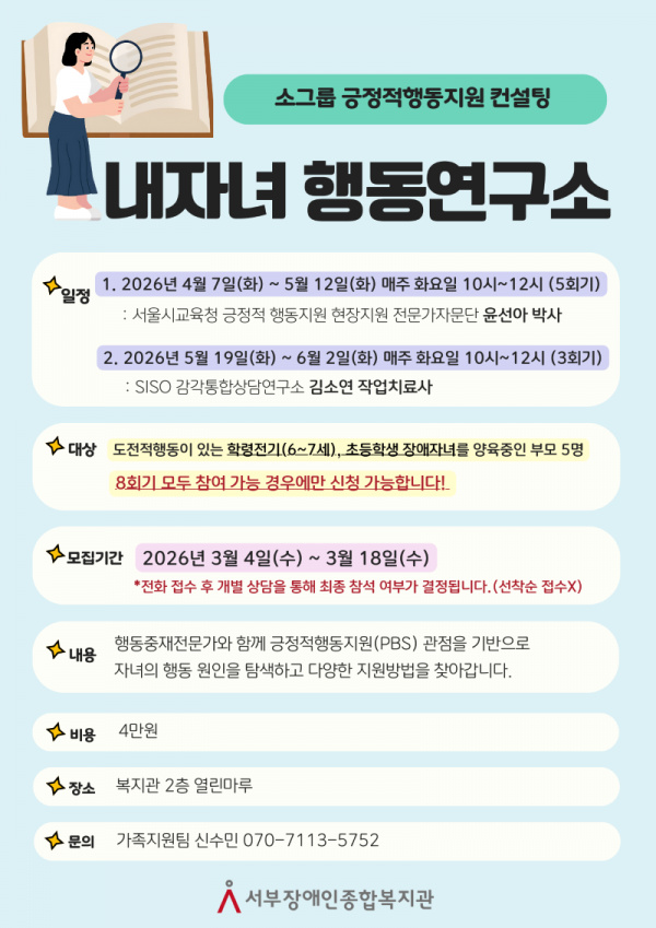 행동중재전문가와 함께 자녀의 행동의 원인을 탐색하고, 다양한 지원 방법을 찾아나가는 "내자녀 행동연구소"를 진행합니다.