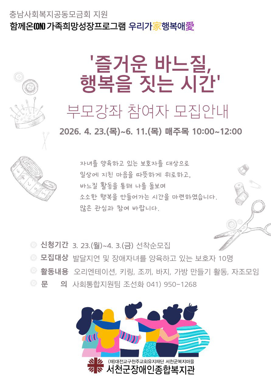 '즐거운 바느질, 행복을 짓는 시간' 부모강좌에 참여자 모집하오니 많은 관심과 참여바랍니다.