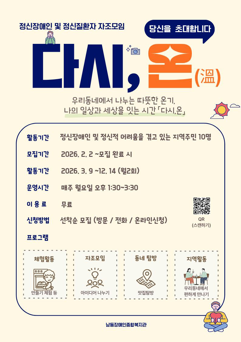 정신장애 당사자 및 정신적 어려움을 겪고 있는 지역주민 (장애등록 여부는 상관없으나 현재 신경정신과 치료 및 약물 복용 등을 통해 꾸준히 마음 건강을 관리하고 계신 분)