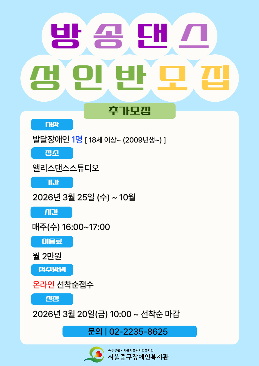 방송댄스(성인) 프로그램 참여자를 아래와 같이 추가 모집하오니 많은 관심과 참여 부탁드립니다!