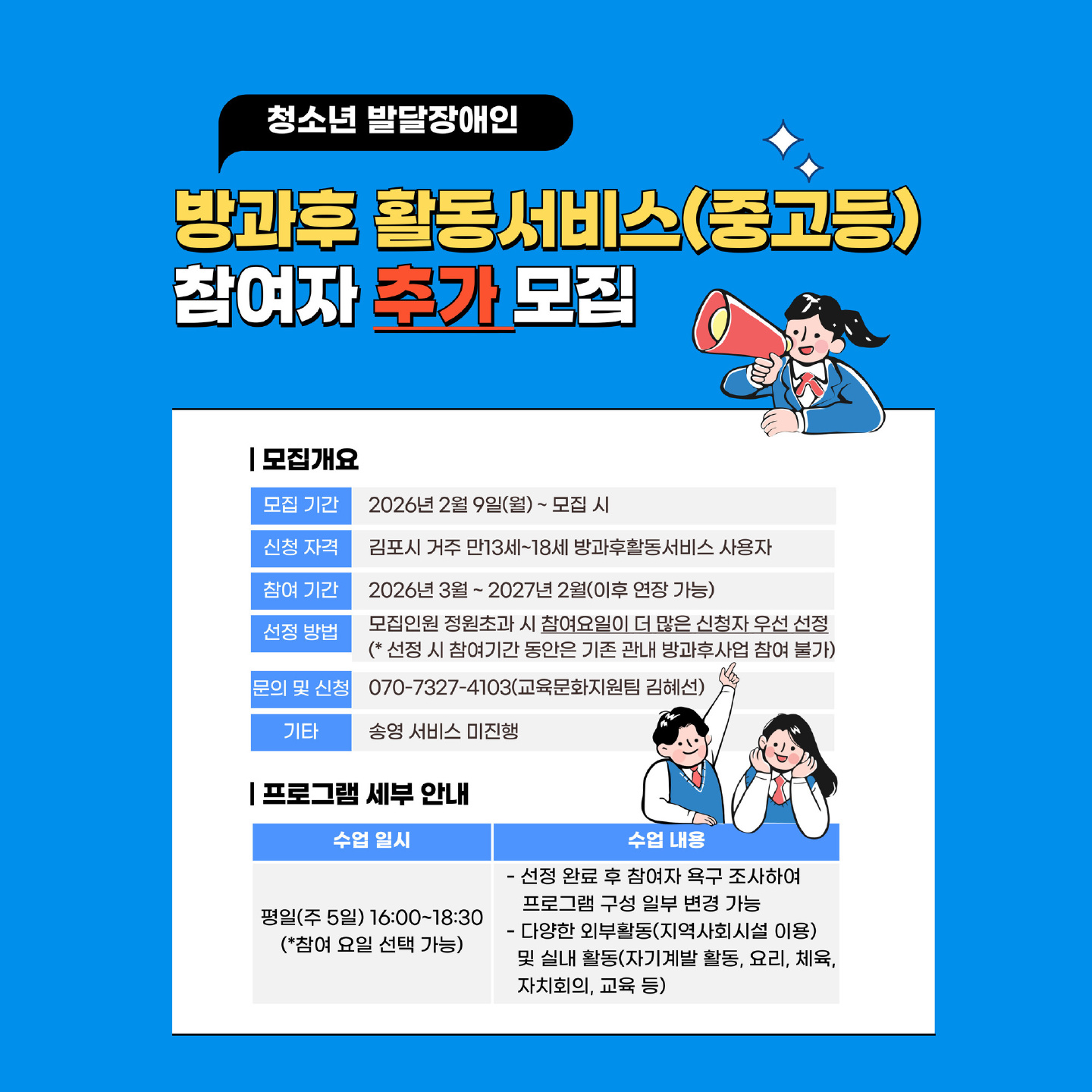 청소년 발달장애인 방과후 활동서비스(중고등) 참여자 추가 모집