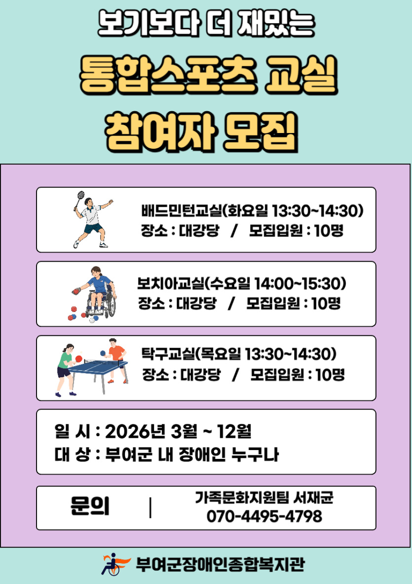 배드민턴 : 화요일 13:30~14:30 / 보치아 : 수요일 14:00~15:30 / 탁구 : 목요일 13:30~14:30