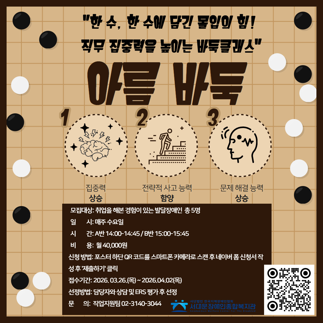 발달장애인 직무 집중력향상을 위한 아름바둑 프로그램 참여자를 모집합니다.