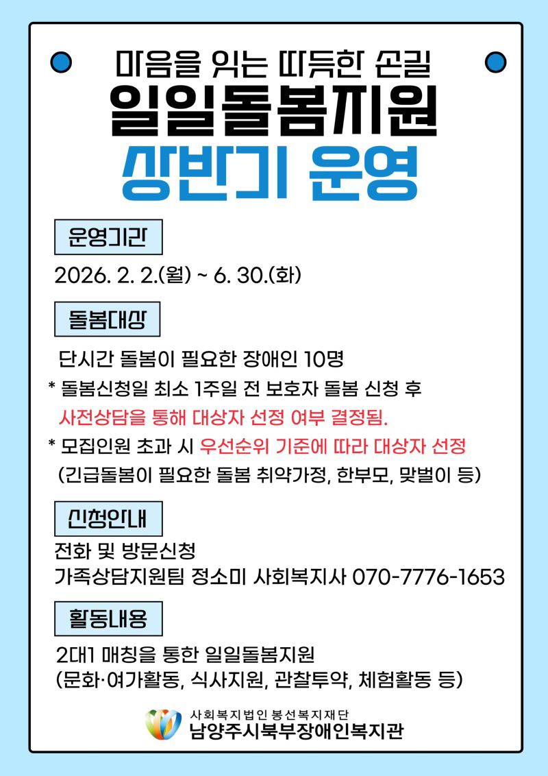 ![2026년 상반기 일일돌봄지원 [마음을 잇는 따듯한 손길] 이용자 모집](https://gwbwlthmhezfxkynvgjp.supabase.co/storage/v1/object/public/admin-contents/curated/1769525250943_edited_1769525129271.jpg)