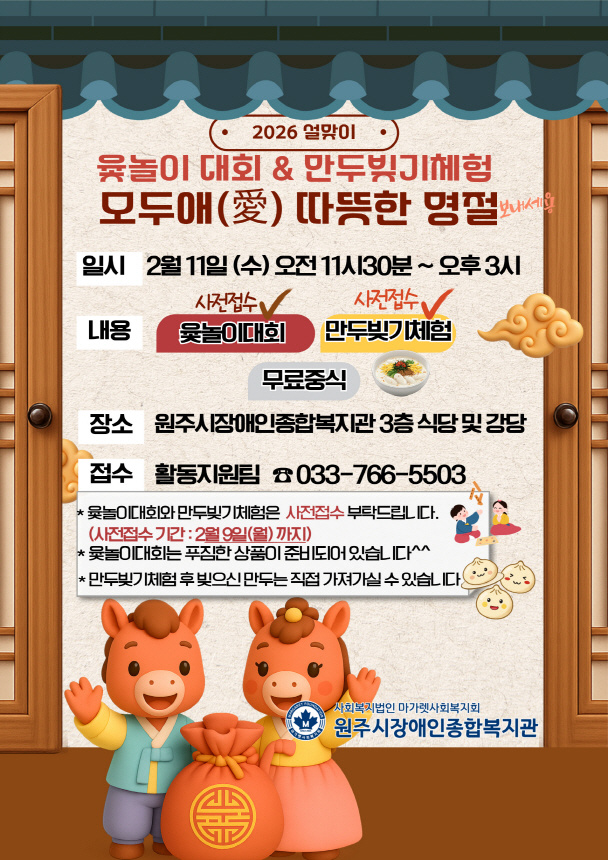 * 내 용 : 무료중식, 윷놀이대회(사전접수), 만두빚기체험(사전접수)