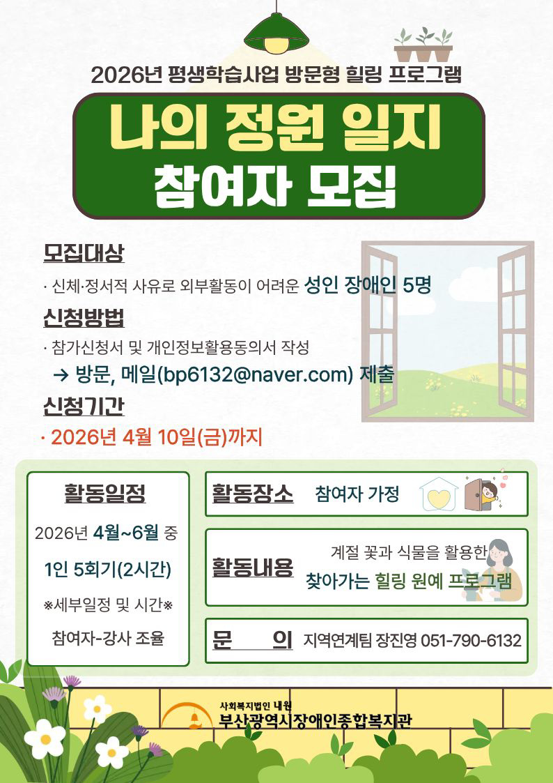 2026년 방문형 힐링 프로그램 「나의 정원일지」참여자 모집