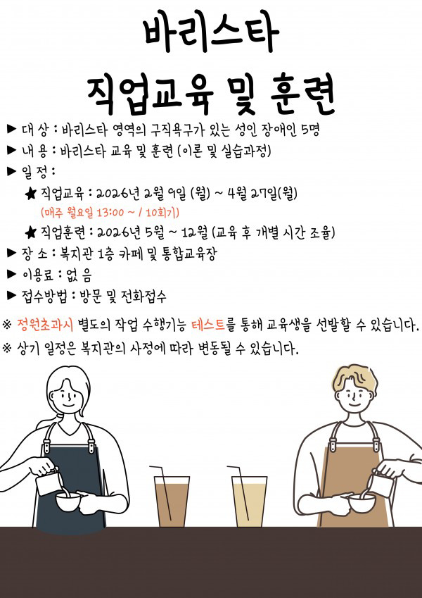 경상북도장애인종합복지관 영덕분관에서 바리스타 수업에 관심있는 분들을 모집합니다.
