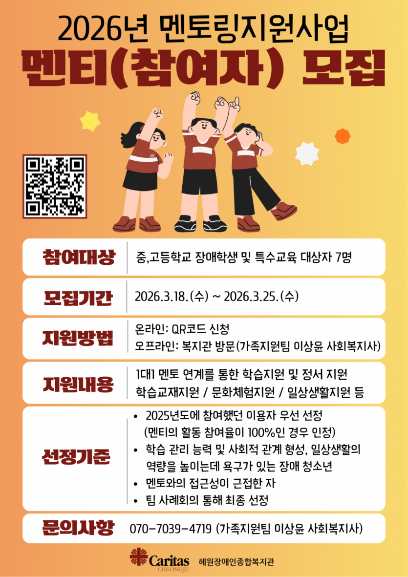 청주시 장애 청소년을 위한 ✨1:1 멘토링 프로그램✨ 참여자를 모집합니다!