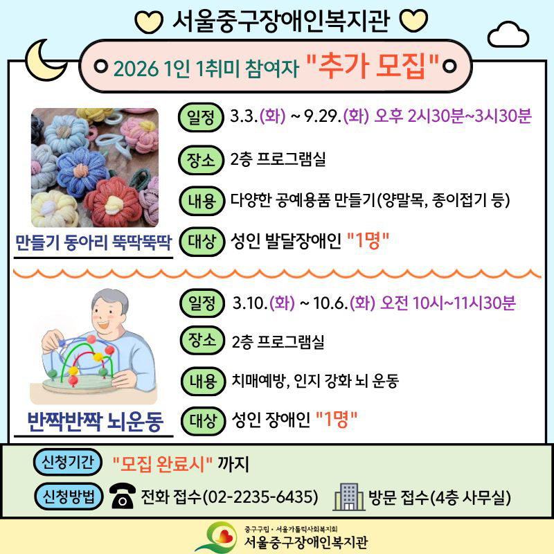 만들기 동아리 '뚝딱뚝딱':성인 장애인 1명/반짝반짝 뇌운동:성인 장애인 1명