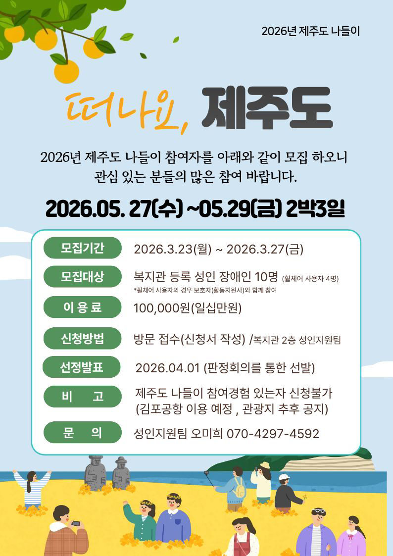 제주도 나들이 참여자를 아래와 같이 모집하오니 관심 있는 분들의 많은 참여 바랍니다.