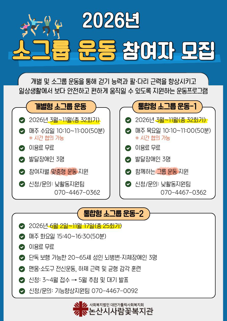 개별형 소그룹 운동:매주 수요일 10:10~11:00 / 통합형 소그룹 운동: 매주 목요일 10:10~11:00 / 통합형 소그룹 운동2 : 매주 화요일 15:40~16:30