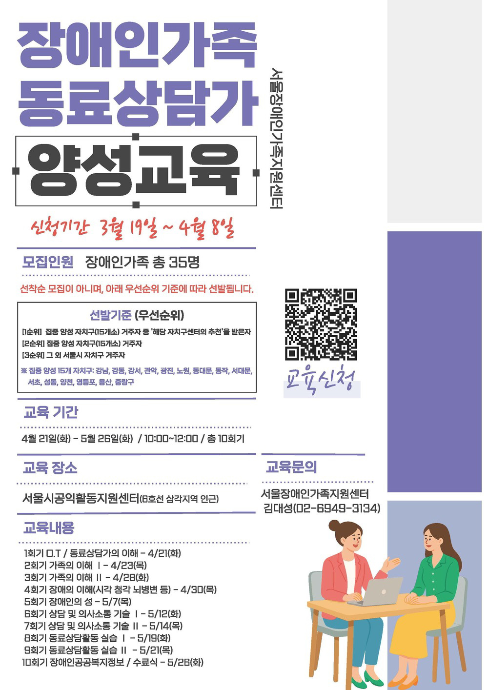 장애인가족의 이야기에 깊이 공감하고, 든든한 지지자가 되어주실 '동료상담가' 양성교육 참여자를 모집합니다.