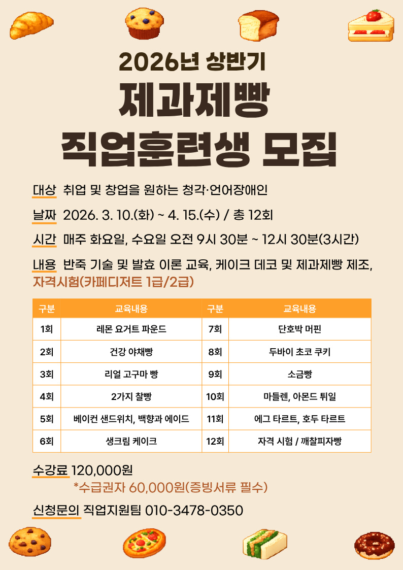 내용: 반죽 기술 및 발효 이론 교육, 케이크 데코 및 제과제빵 제조, 자격시험(카페디저트 1급/2급)