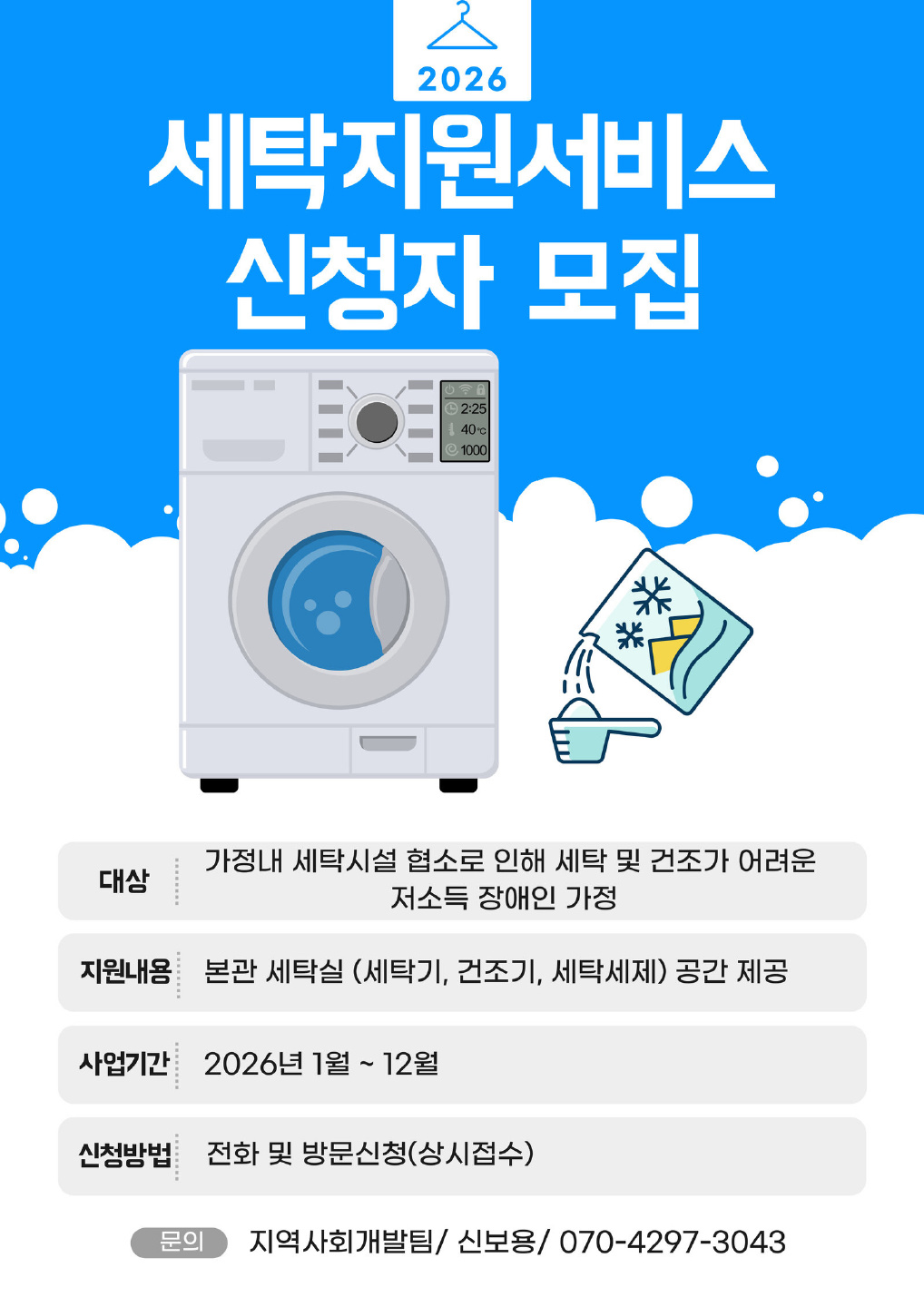 *지원내용: 본관 2층 세탁실 공간 제공(세탁기, 건조기, 세탁세제 구비) *신청문의: 지역사회개발팀 신보용