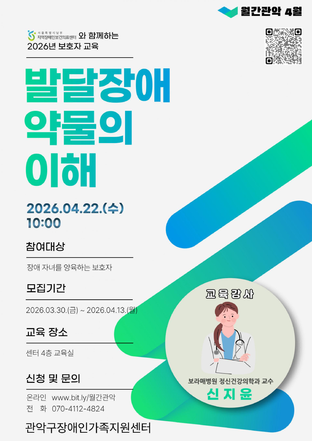 약물에 대한 올바른 이해 및 복용을 위한 「발달장애 약물의 이해」를 진행하오니 장애자녀를 양육하는 보호자님의 많은 참여 부탁드립니다.