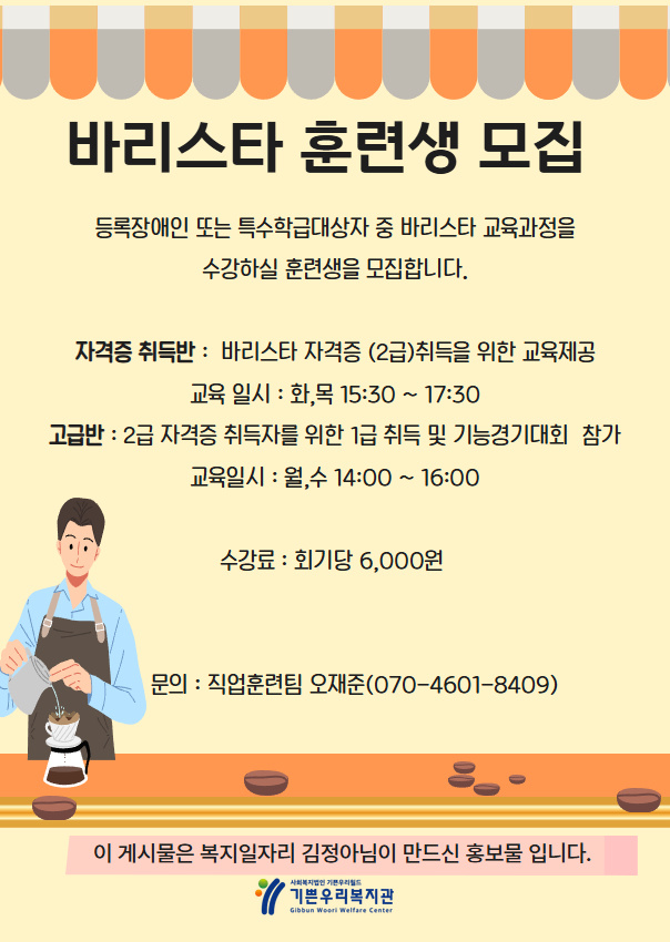 바리스타 교육과정을 수강하실 훈련생을 모집합니다.