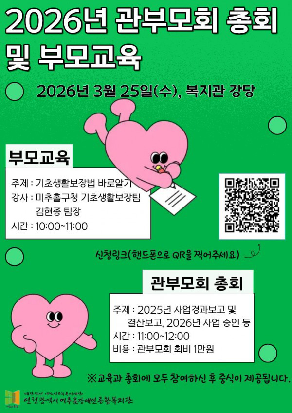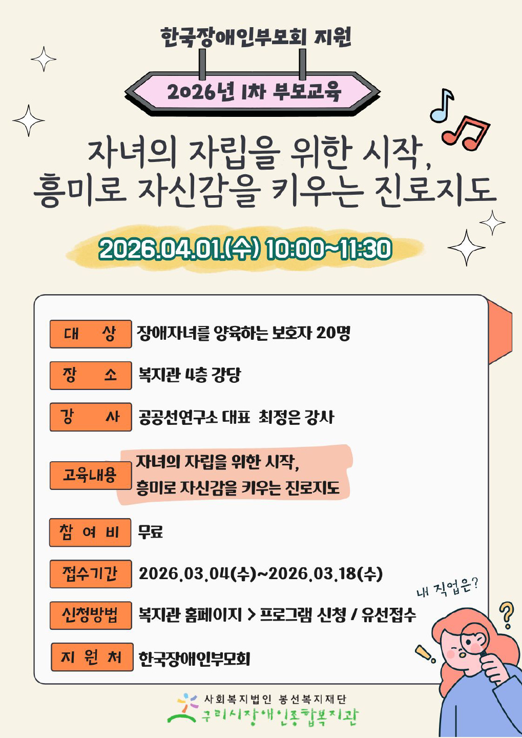 장애자녀를 양육하는 보호자들의 양육효능감 향상과 가족 역량 강화를 위해서 부모교육을 진행하고자 합니다.