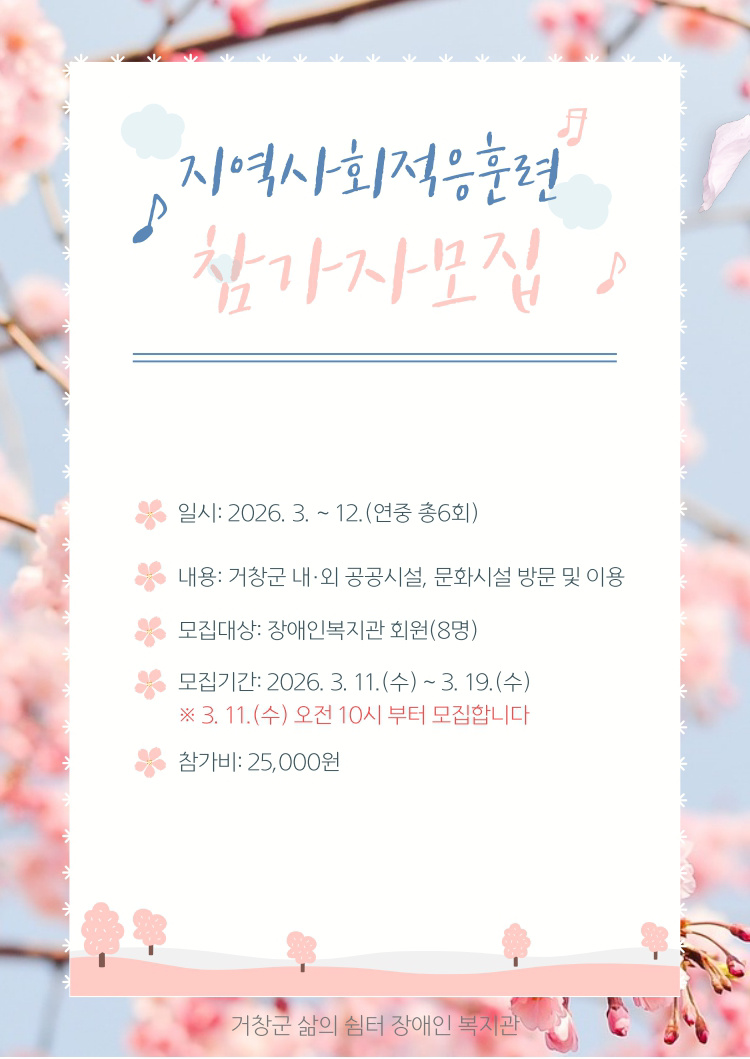 2026년 장애인 복지관 지역사회적응훈련 참가자 모집