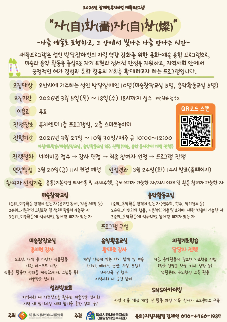 2026년 장애인복지시설 재활프로그램"자(自)화(畵)자(自)찬(燦)" 참여 이용자 모집