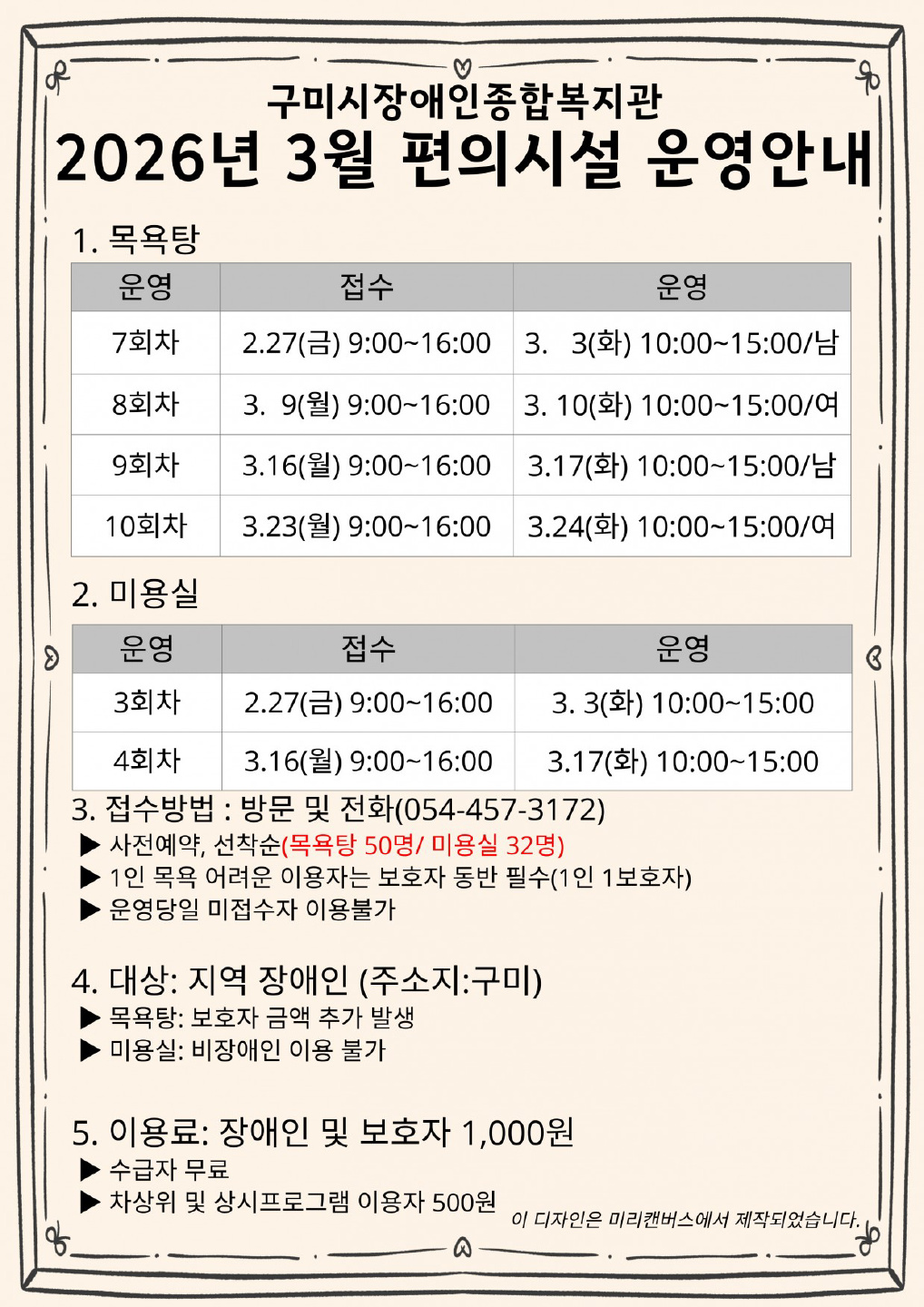 26년 3월 편의시설(목욕/미용) 운영안내