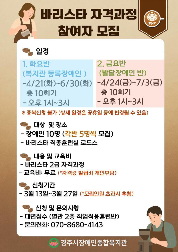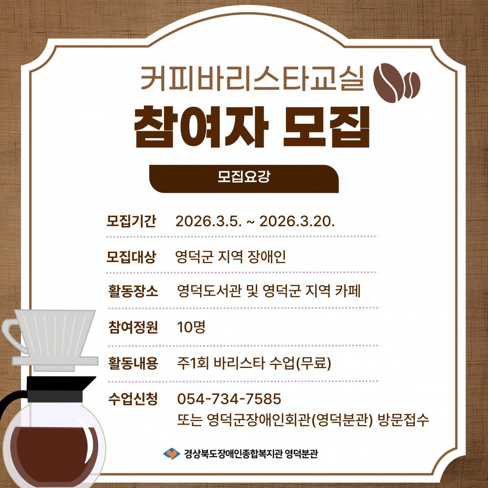 경상북도장애인종합복지관 영덕분관에서 바리스타 수업에 관심있는 분들을 모집합니다.